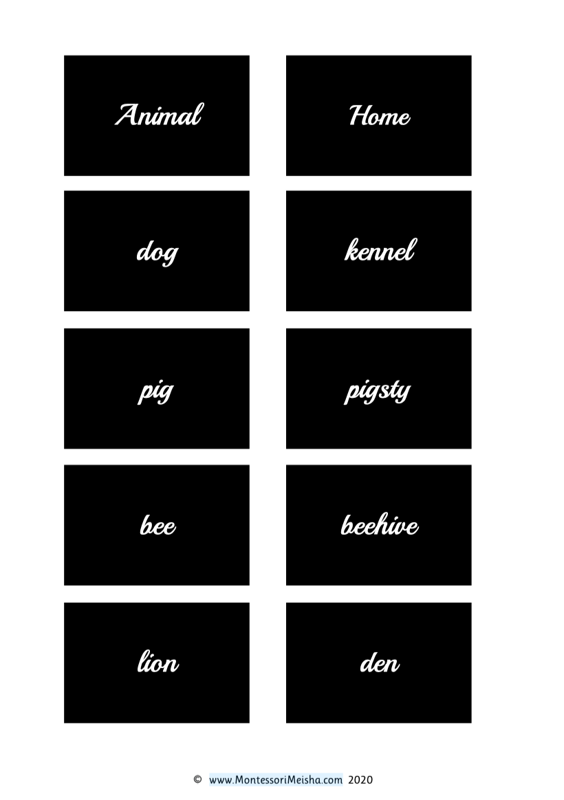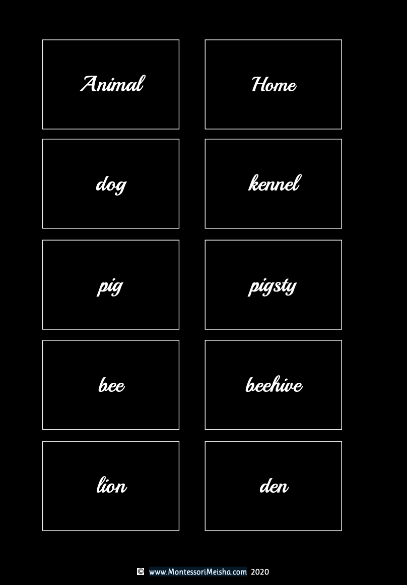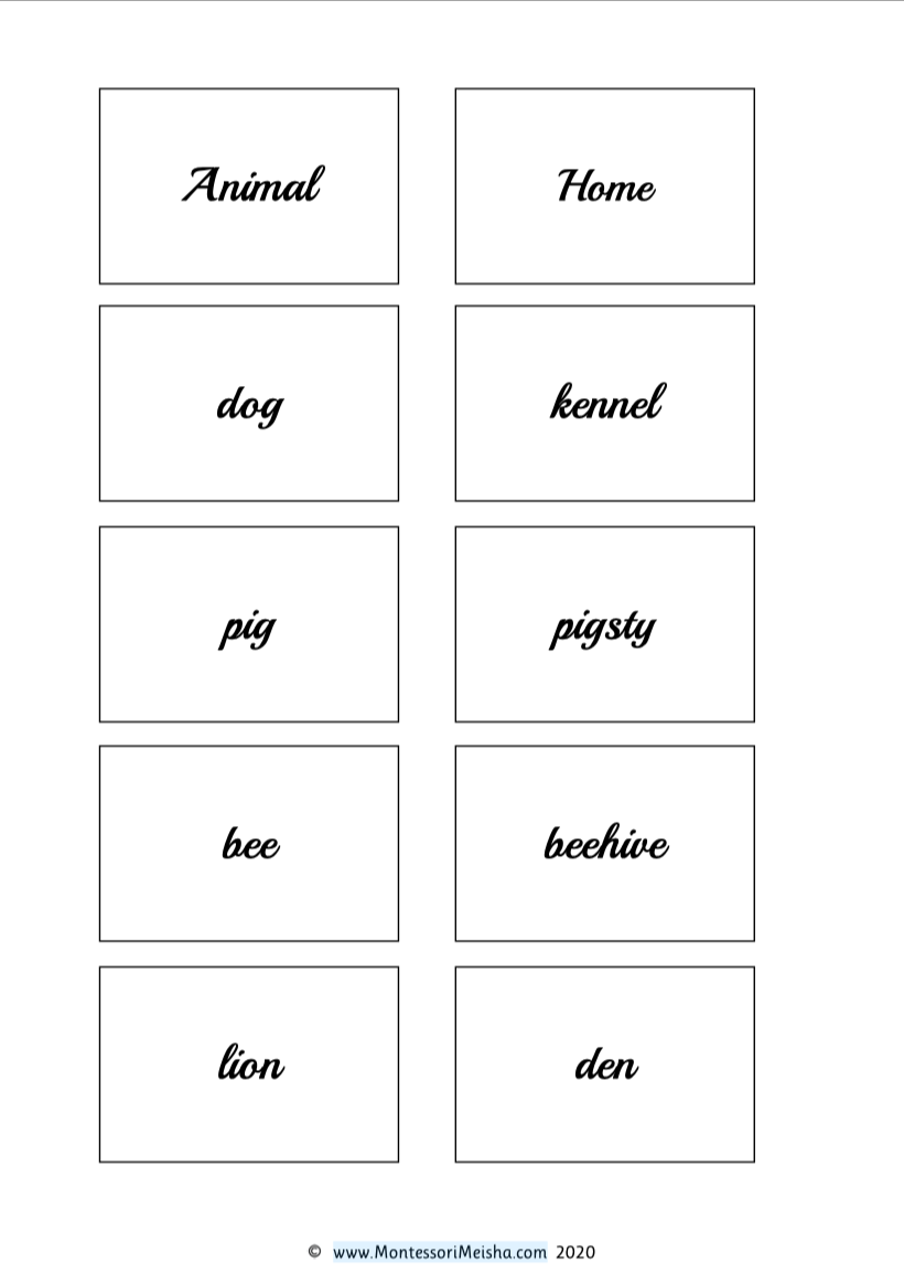 This printable sorting material introduces children to 10 animals and their homes through a flexible matching activity that can be used as one lesson or divided into two. Also available in print — see the Montessori Grammar Box Cursive collection in this store.