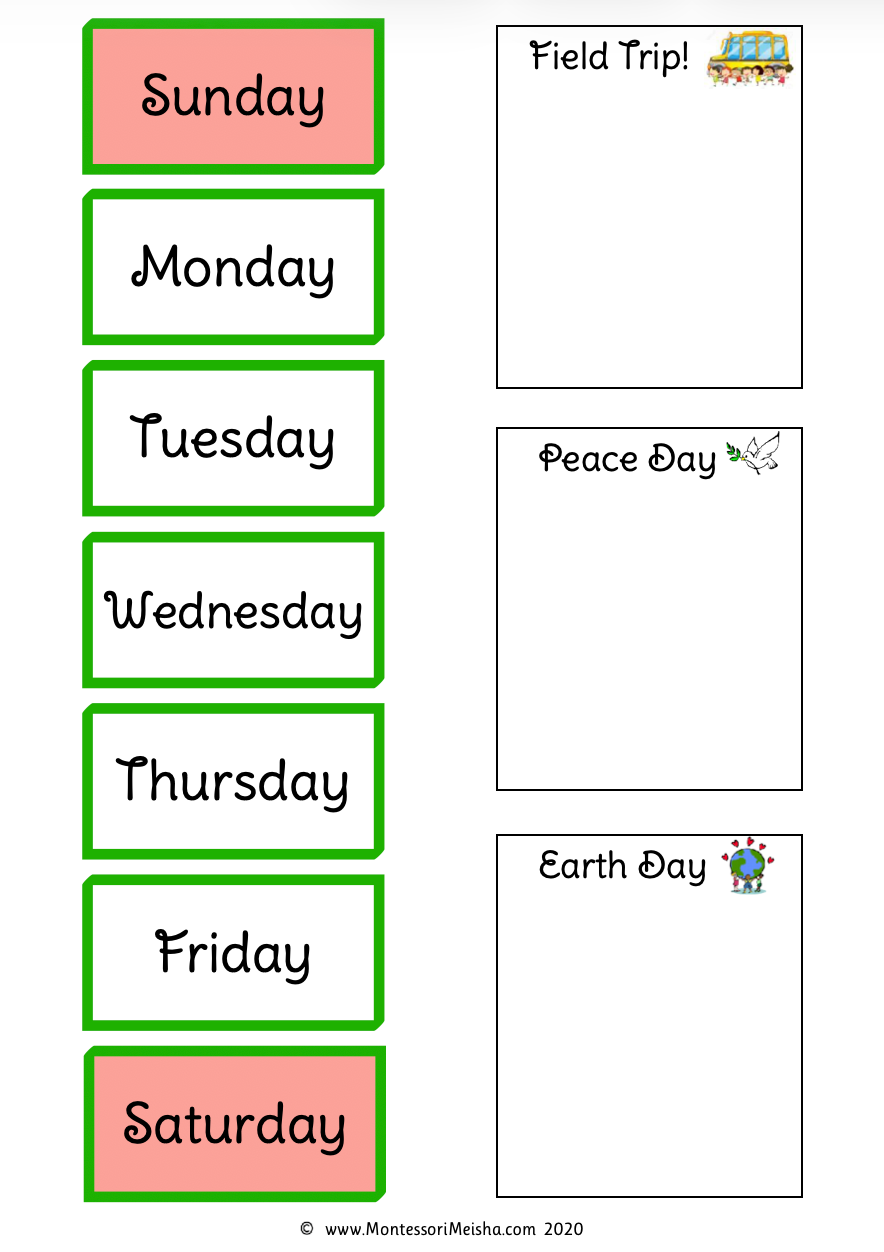• Special day cards: Birthday, Field Trip, Earth Day, Peace Day, Half Day and No School