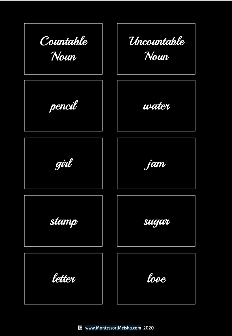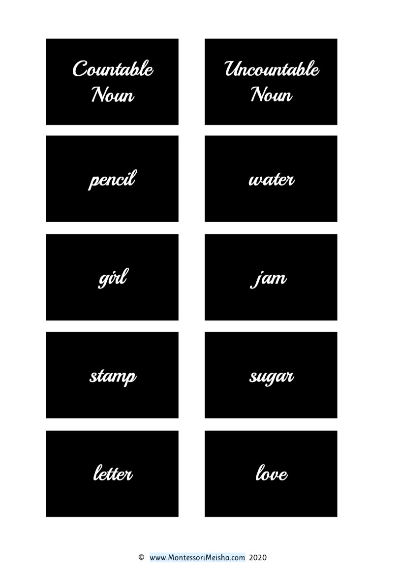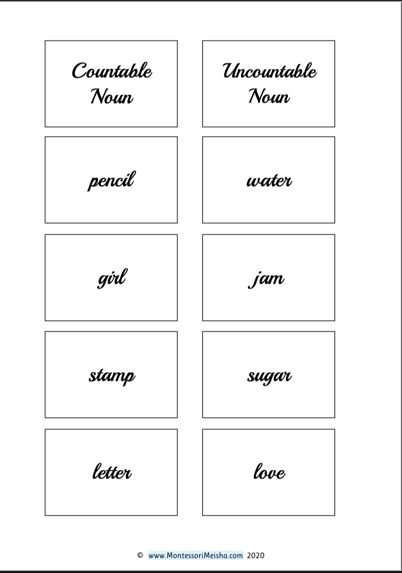 This printable sorting material introduces children to one of the more nuanced distinctions in English grammar, the difference between countable and uncountable nouns, a key component of Montessori noun work at the elementary level. Also available in print — see the Montessori Grammar Box Cursive collection in this store.