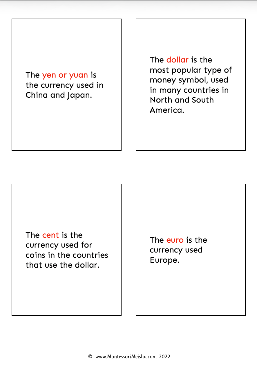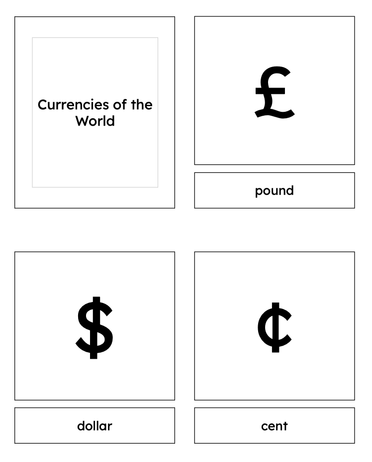 - 6 three-part card sets covering: Dollar, Euro, Pound, Rupee, Cent and Yen/Yuan