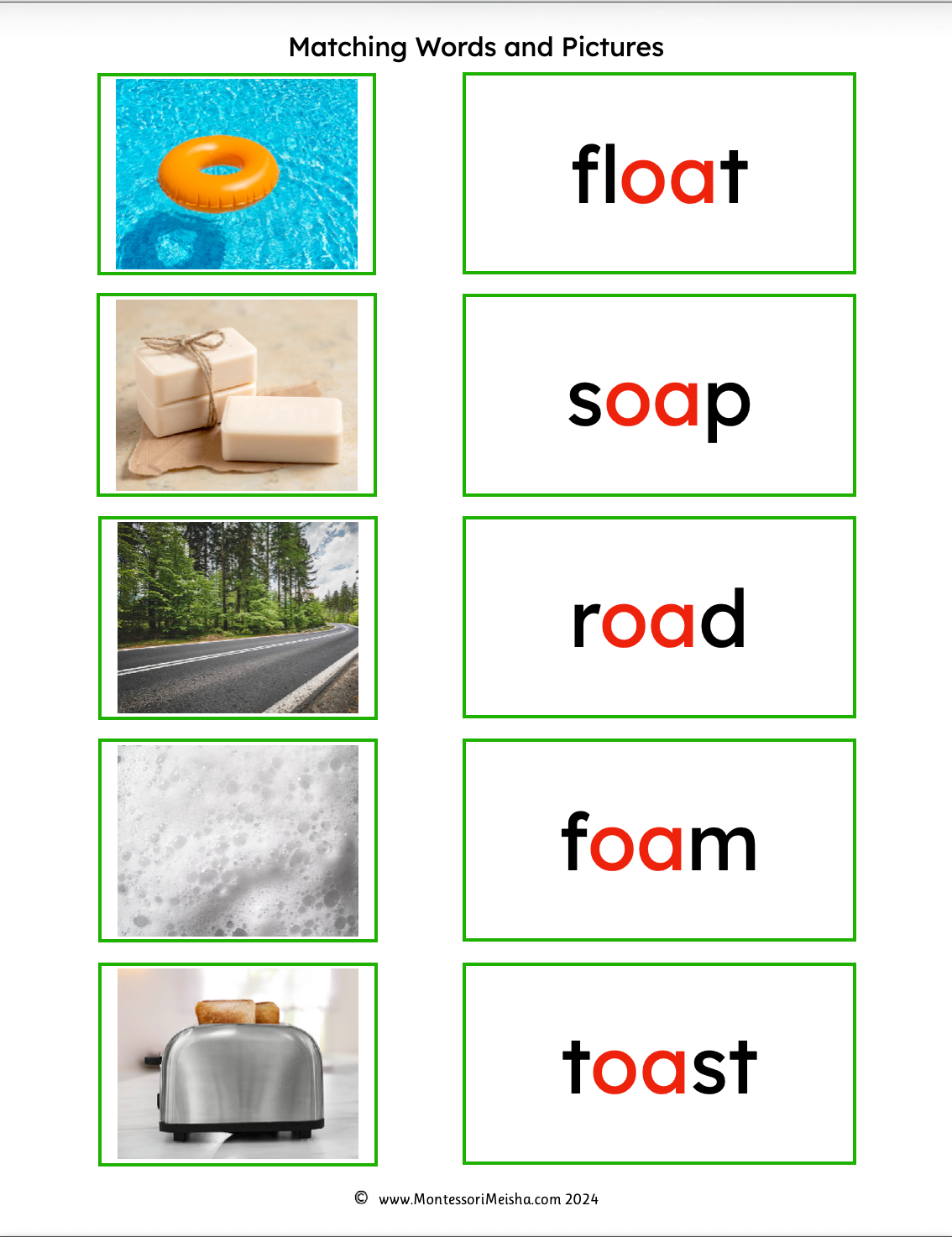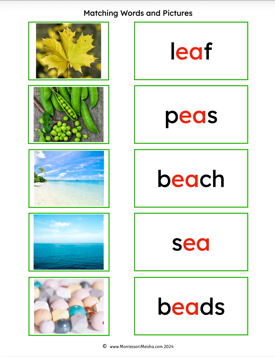 How to use: Children match each photograph card to its corresponding word card, then self-check using the control cards. Works alongside the Montessori moveable alphabet or as a standalone phonogram reading activity. The natural culmination of the matching words and pictures series, following the Pink and Blue Series also available in this store.