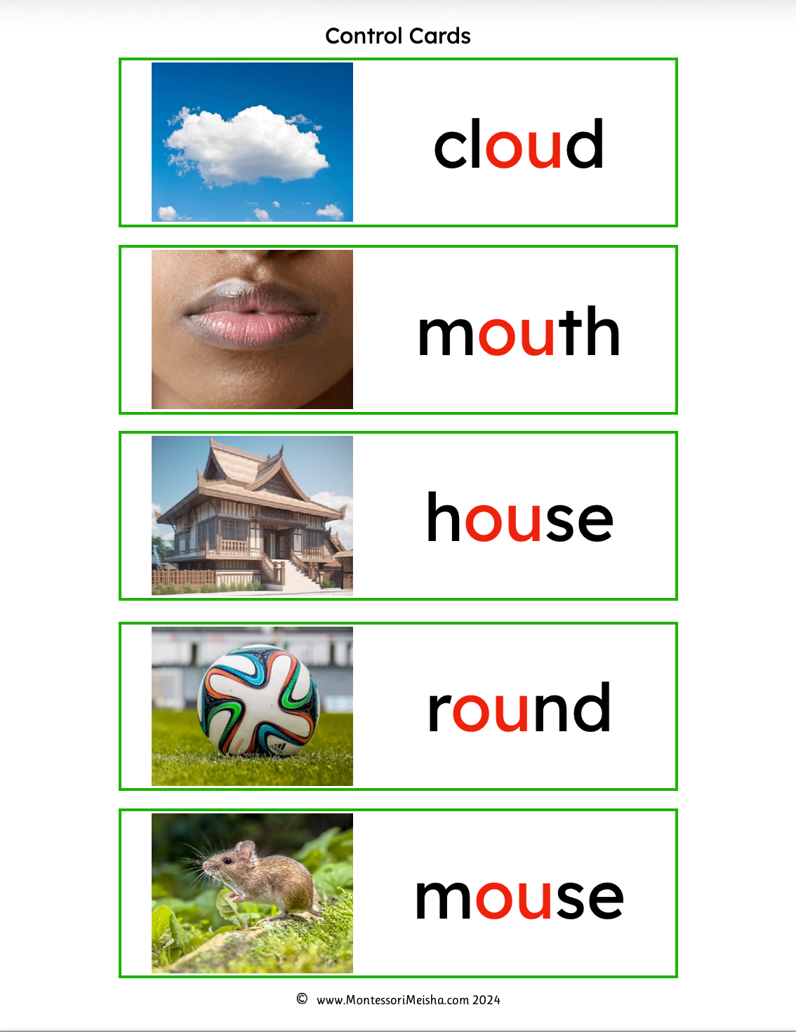 - Real photograph cards paired with phonogram word cards, colour coded in traditional Montessori colours: consonants in red and vowels in blue