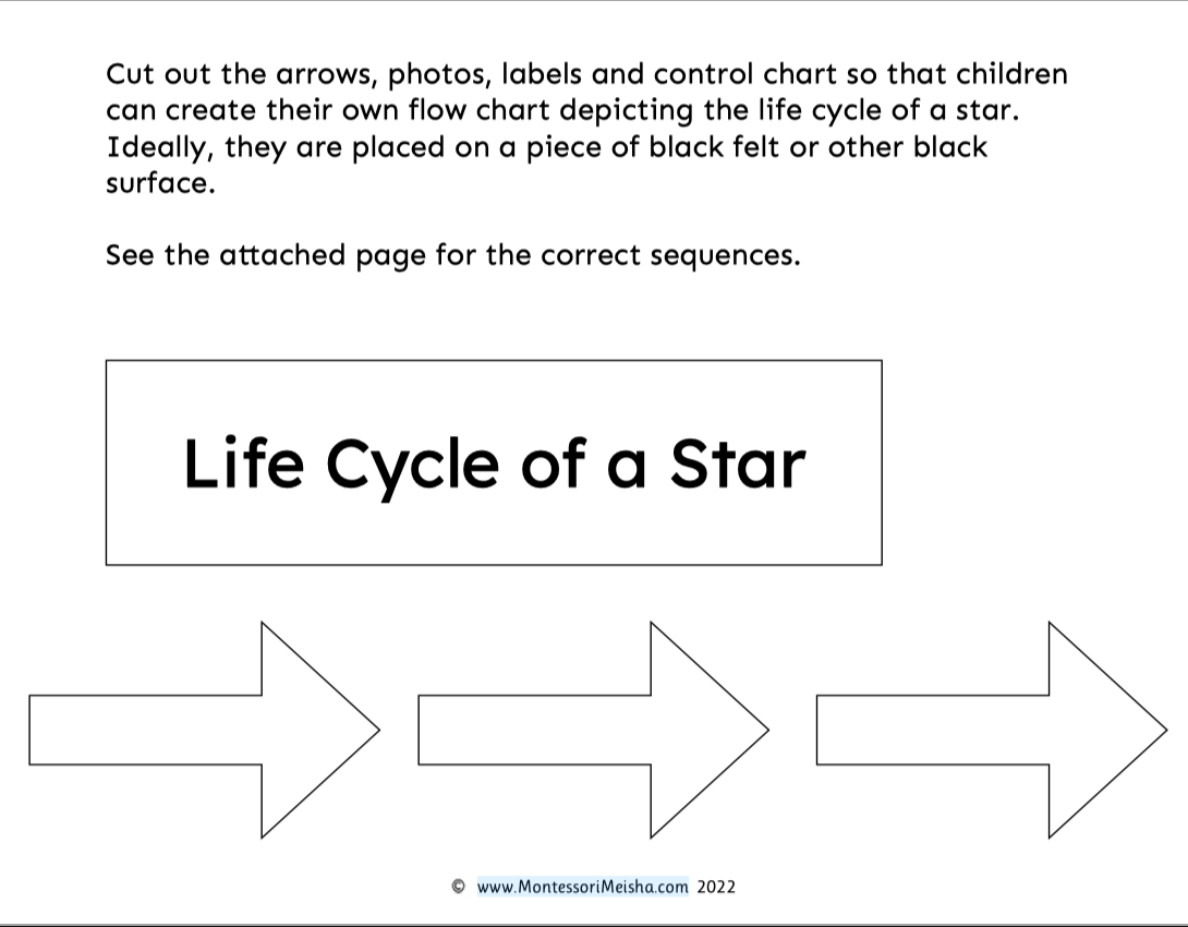 How to use: Cut out the photograph cards, labels and arrows for children to arrange on a black surface, ideally black felt, to recreate the life cycle of a star as a flowchart. The control chart allows for independent self-checking once the work is complete. Follows naturally from the Montessori Great Lessons and lessons on the Big Bang and sequence of events. A work that children return to again and again.