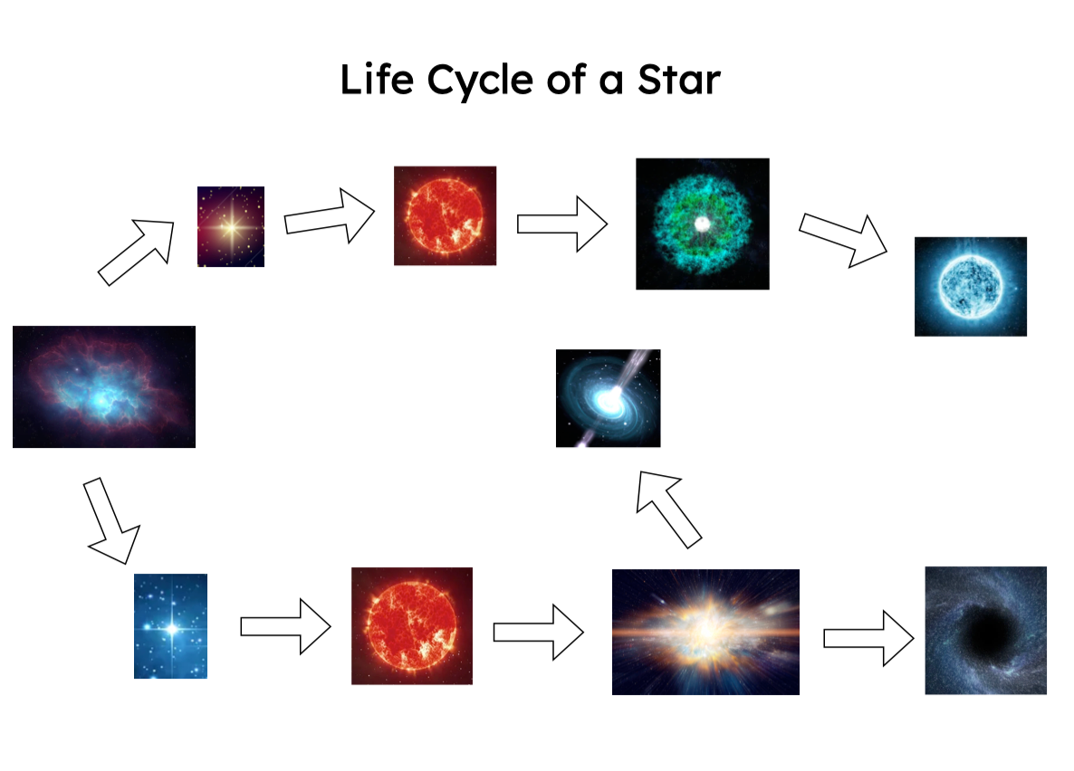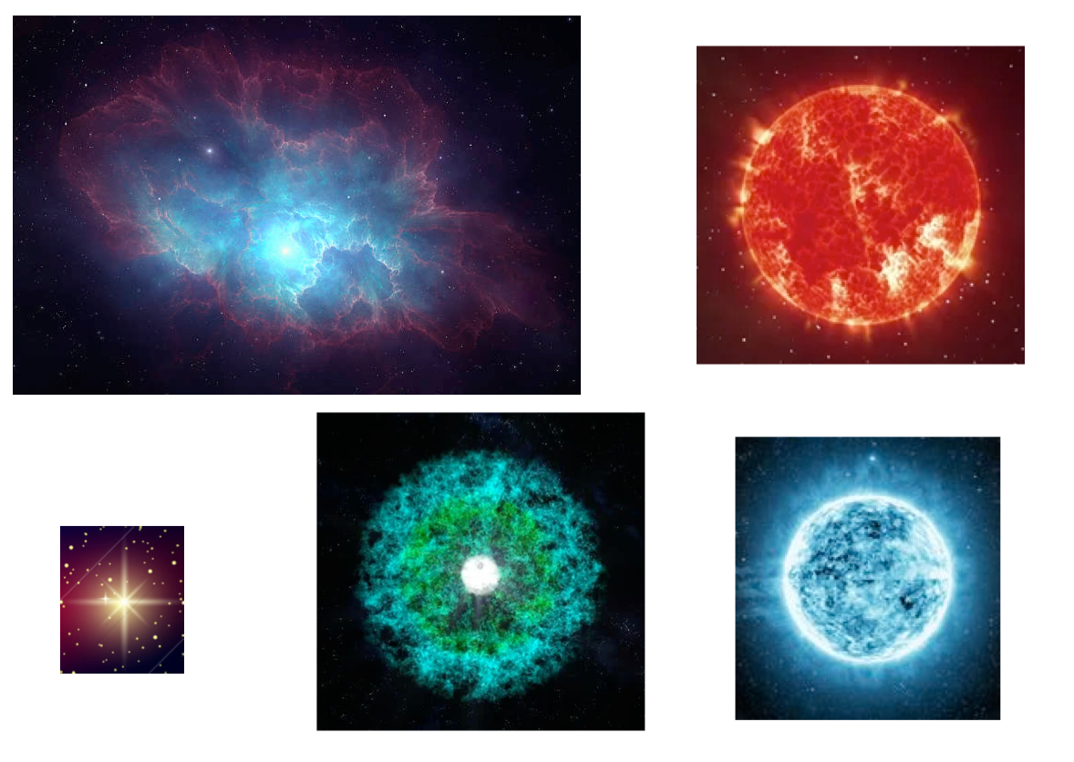 - Real astronomical photograph cards for each stage of the star’s life cycle: Stellar Nebula, Average Star, Massive Star, Red Giant, Red Supergiant, Planetary Nebula, Supernova, White Dwarf, Neuron Star and Black Hole