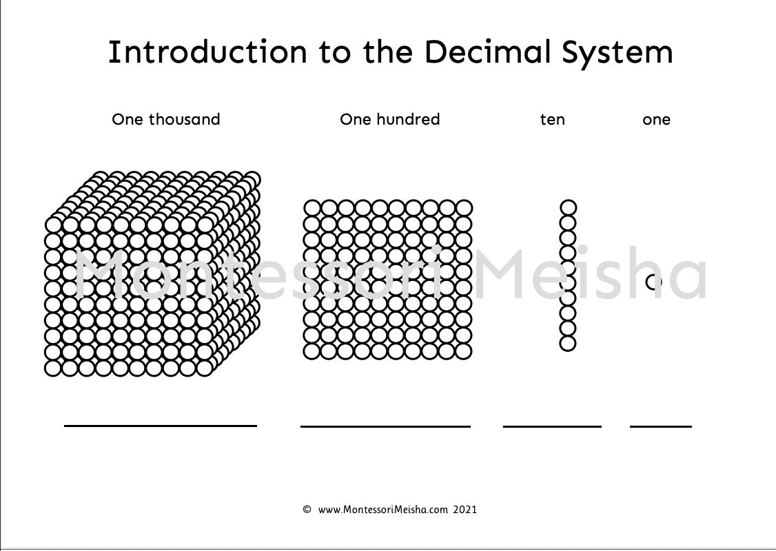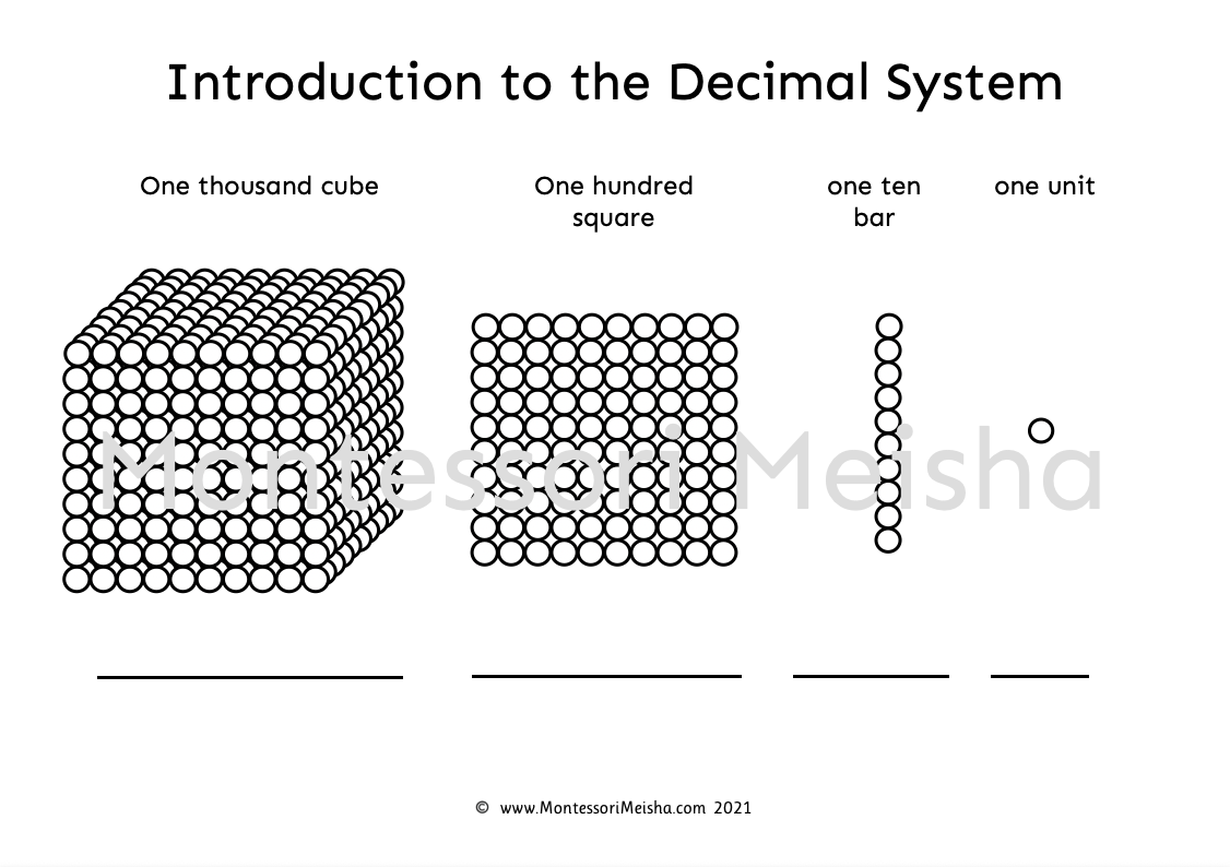 How do you make place value truly make sense to a young child? You show them. This printable worksheet introduces the four categories of the Montessori decimal system (one unit, one ten bar, one hundred square and one thousand cube) through the iconic golden bead visual representations, making the relationship between each place value category immediately and concretely apparent.