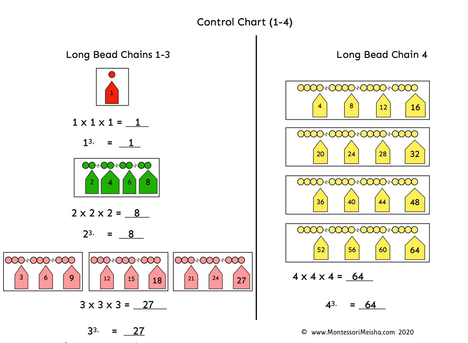• Control chart with colour coded beads in traditional Montessori bead colours for independent self-checking