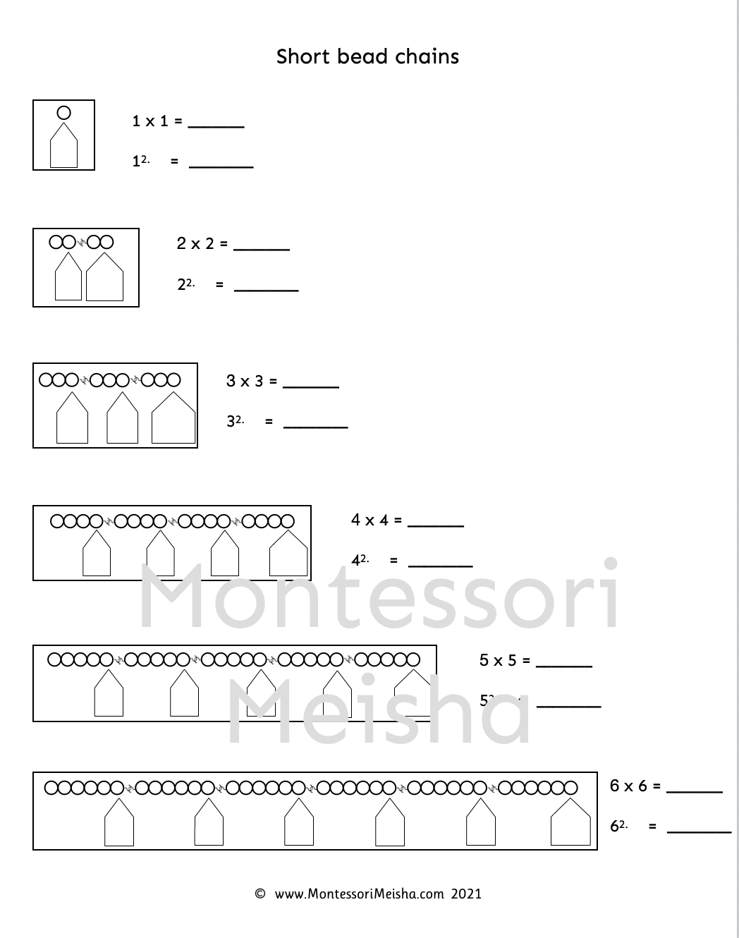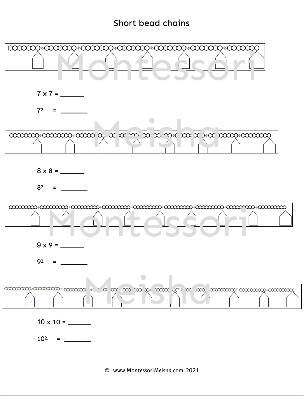 This printable worksheet covers all ten short bead chains in one PDF, showing both multiplication notation and exponent notation side by side, giving children a concrete and visual introduction to the concept of squaring numbers.
