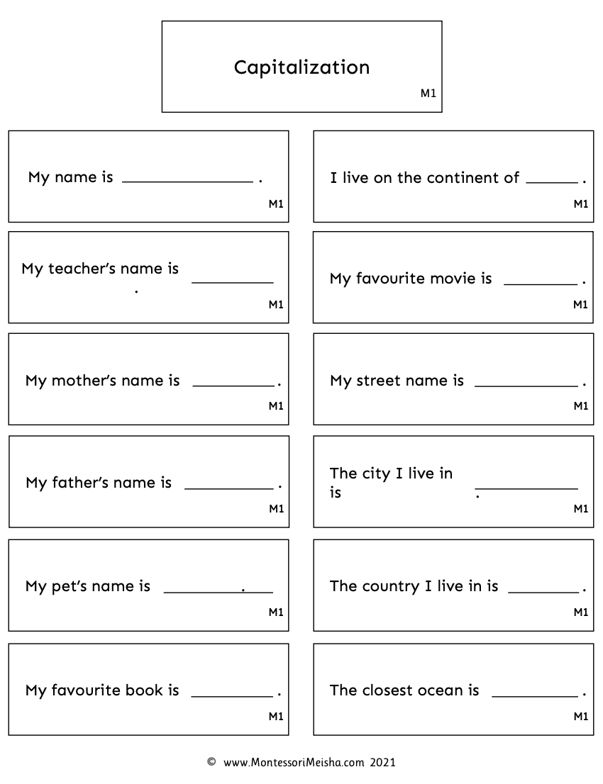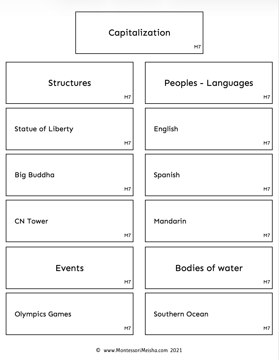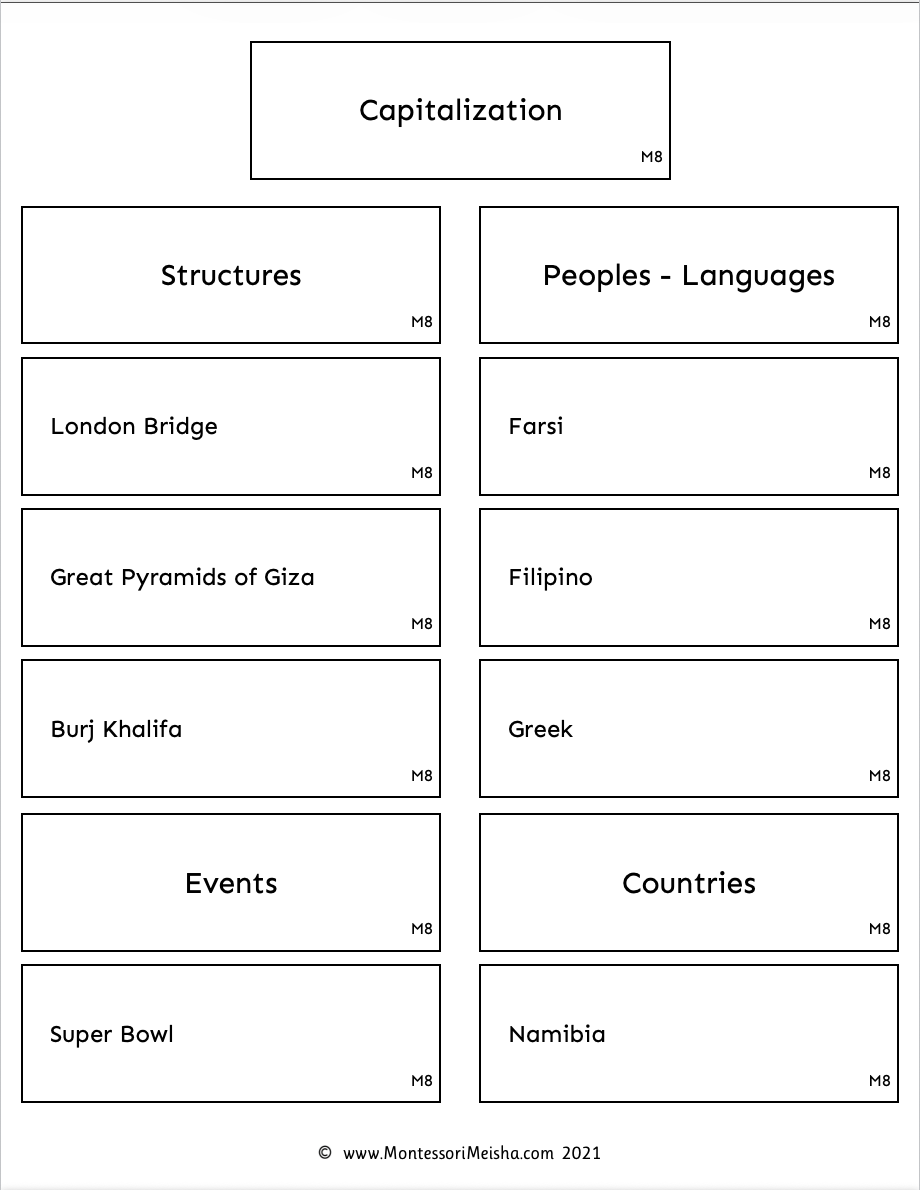 How to use: Children cut out each card and categorise them according to the correct capitalisation rule. Works alongside the Montessori Skyscraper Checklist also available in this store so children and teachers can track progress across all 10 lessons. A wonderful activity for reinforcing when and why we use capital letters in a hands-on and self-directed way.
