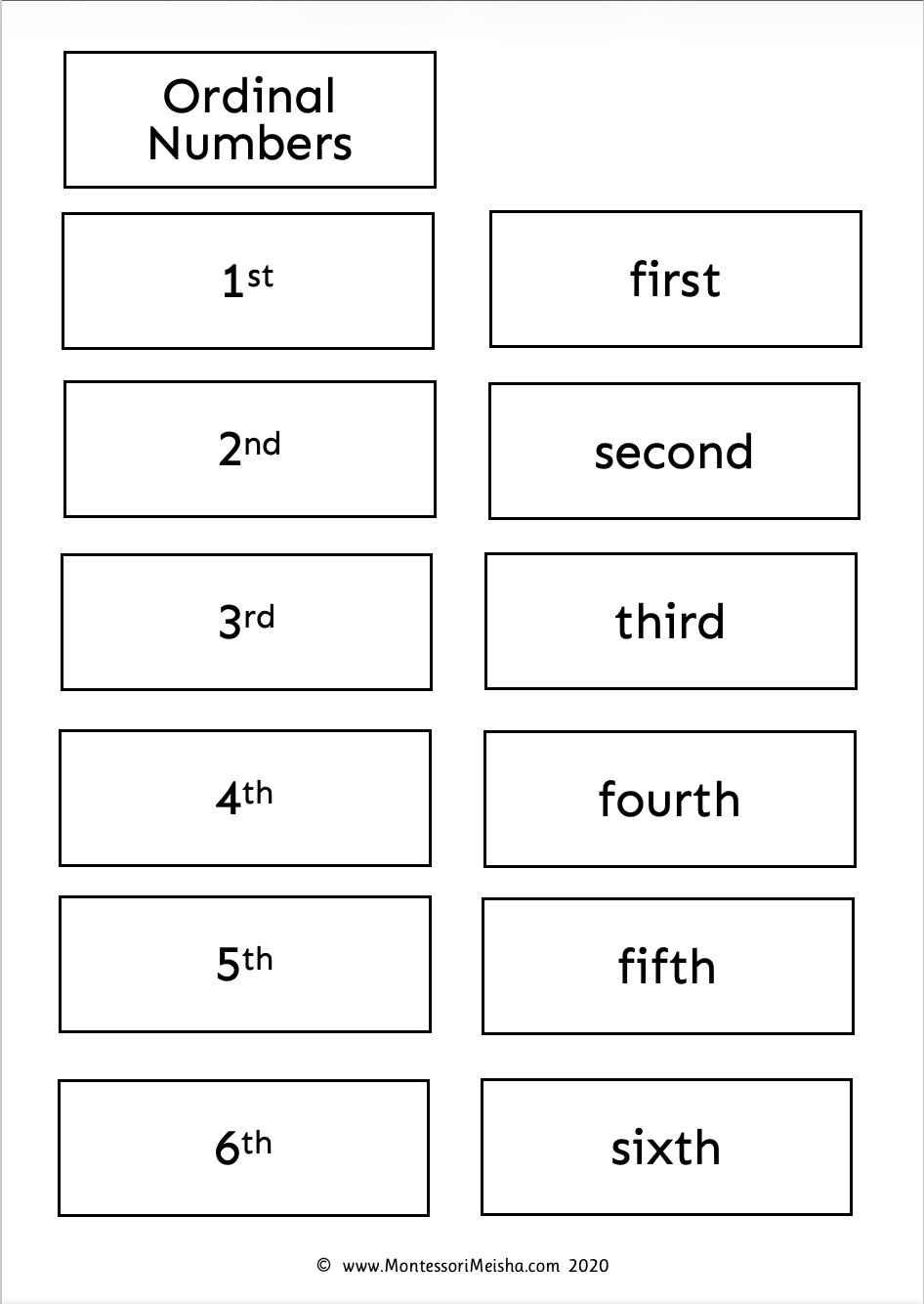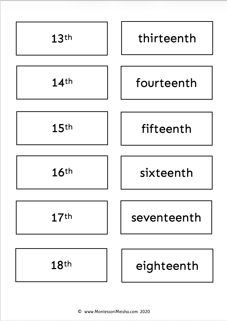 - Matching cards pairing ordinal number symbols with their corresponding words