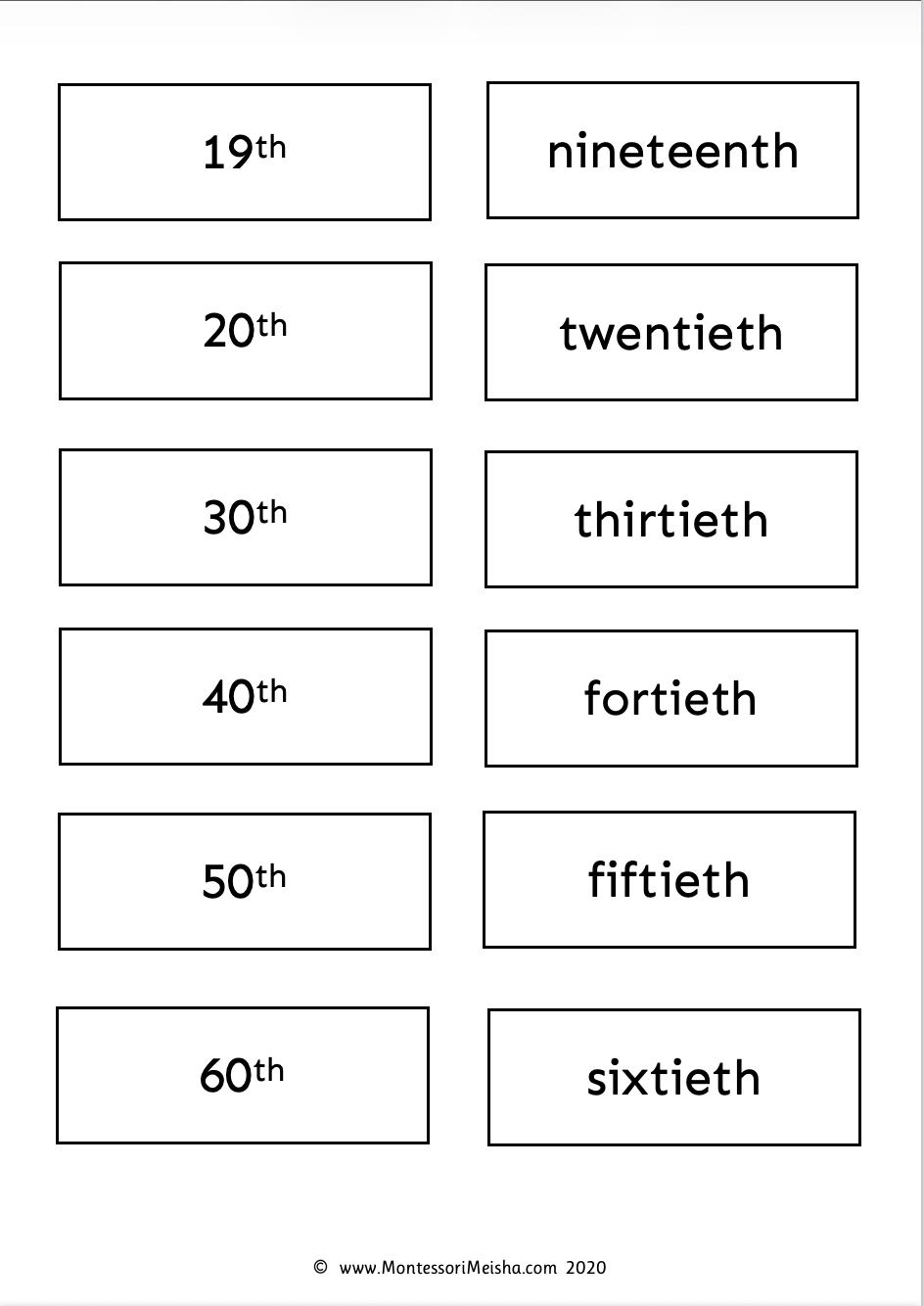 - Sorting cards covering ordinal numbers 1st to 20th consecutively, then 30th, 40th, 50th, 60th, 70th, 80th, 90th and 100th