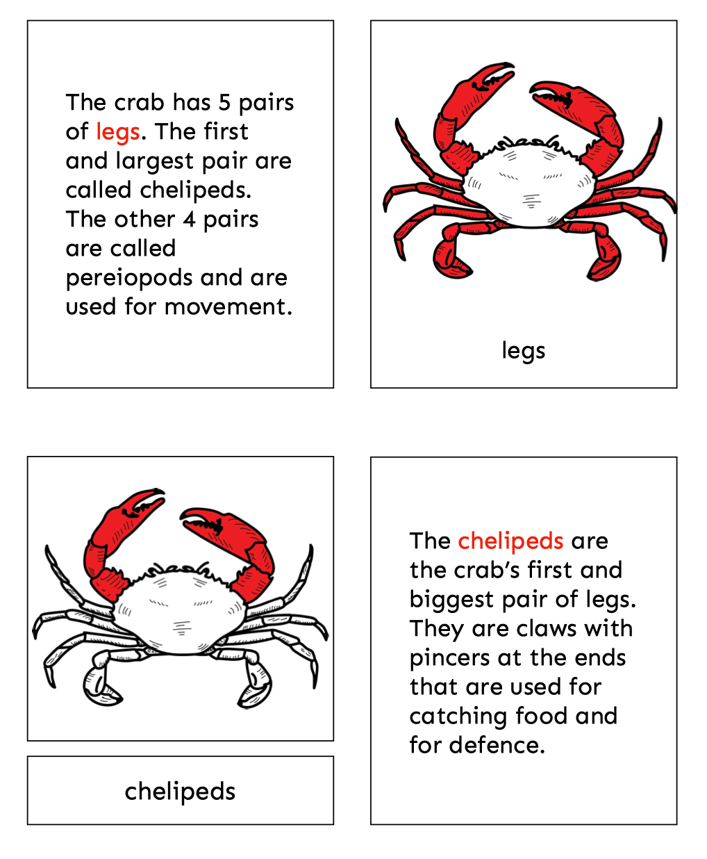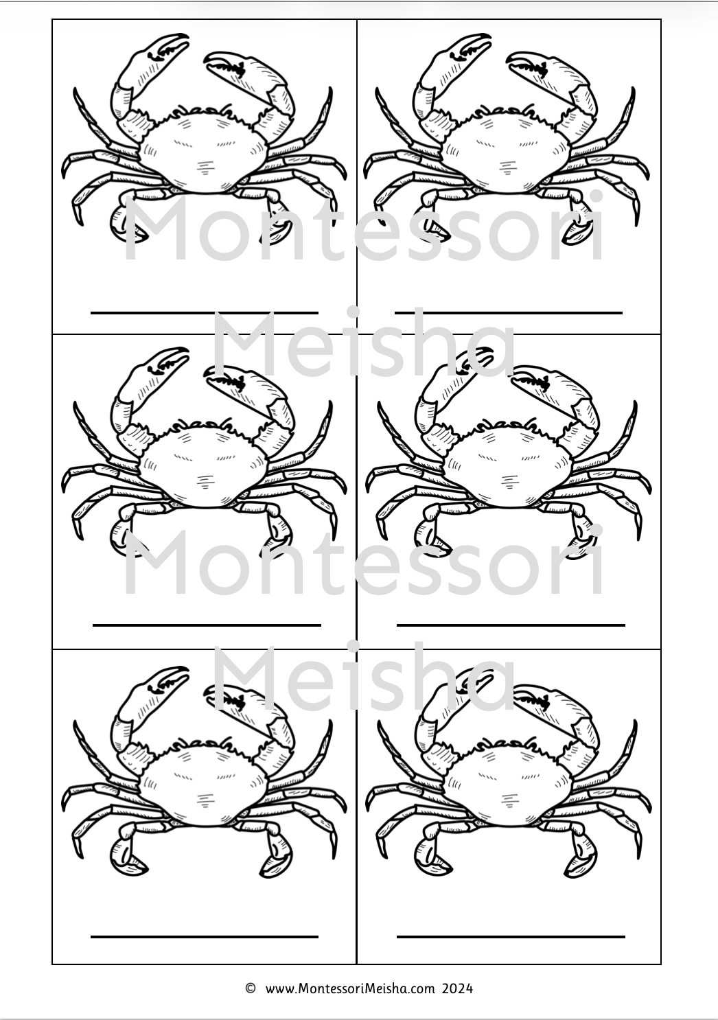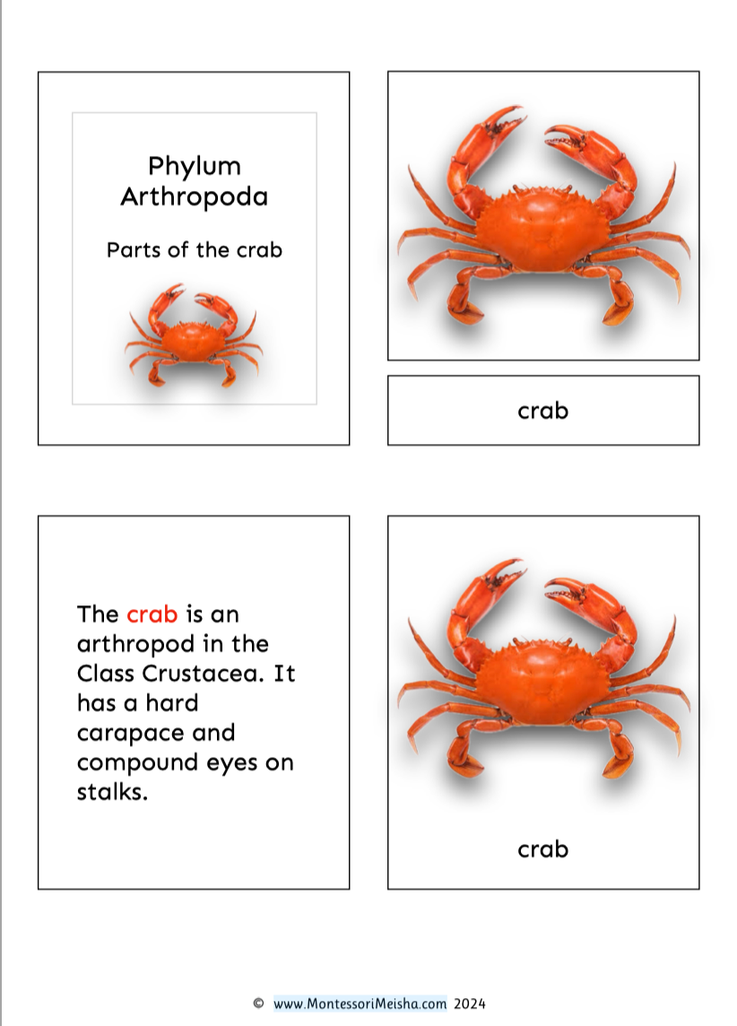 These printable Montessori nomenclature cards introduce children to the parts of the crab through a real photograph cover card and detailed scientific illustrations, paired with child-friendly descriptions.