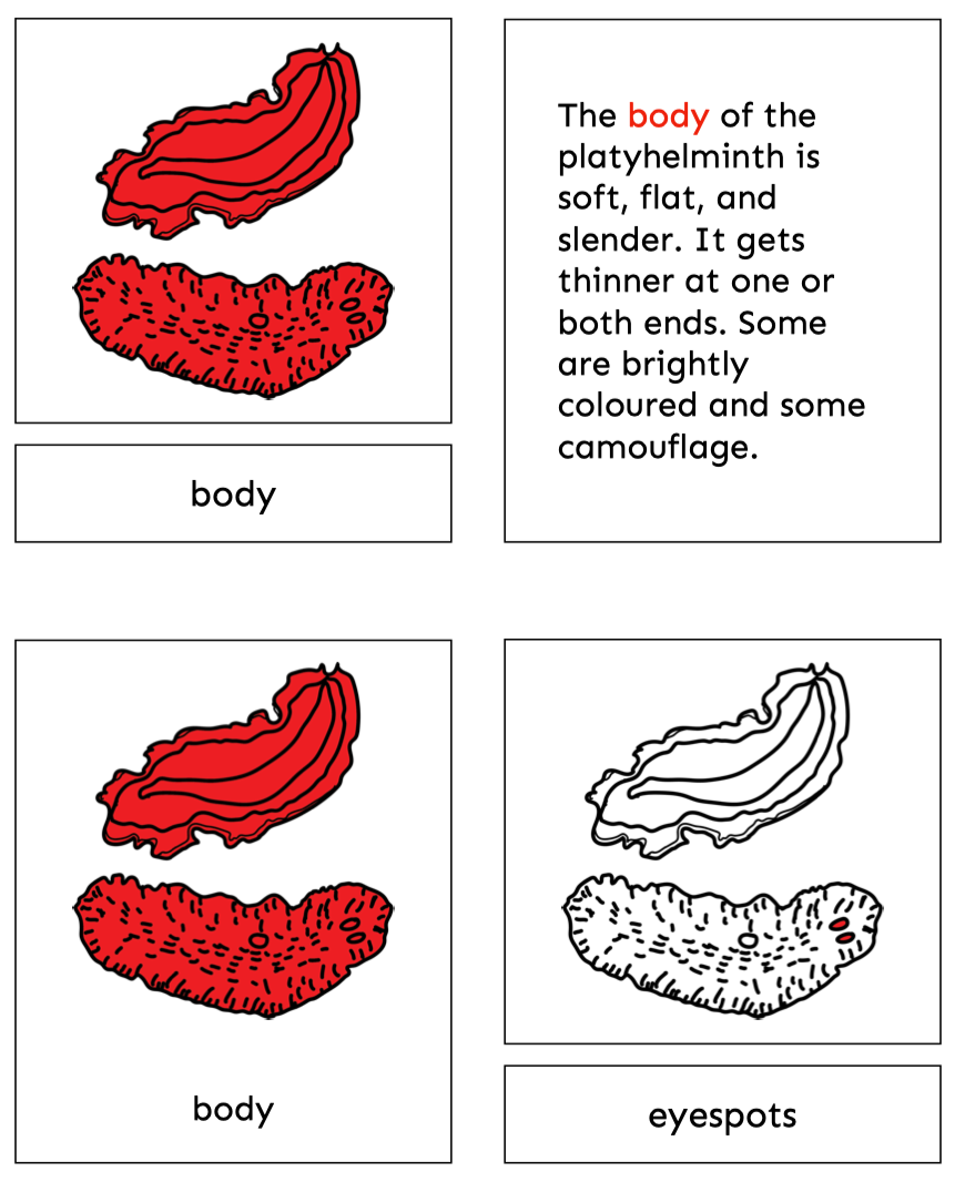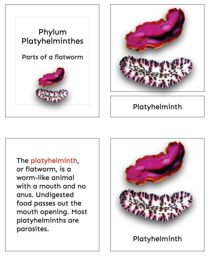 These printable Montessori nomenclature cards introduce children to the parts of the Flatworm through a real photograph cover card and detailed scientific illustrations, paired with child-friendly descriptions.