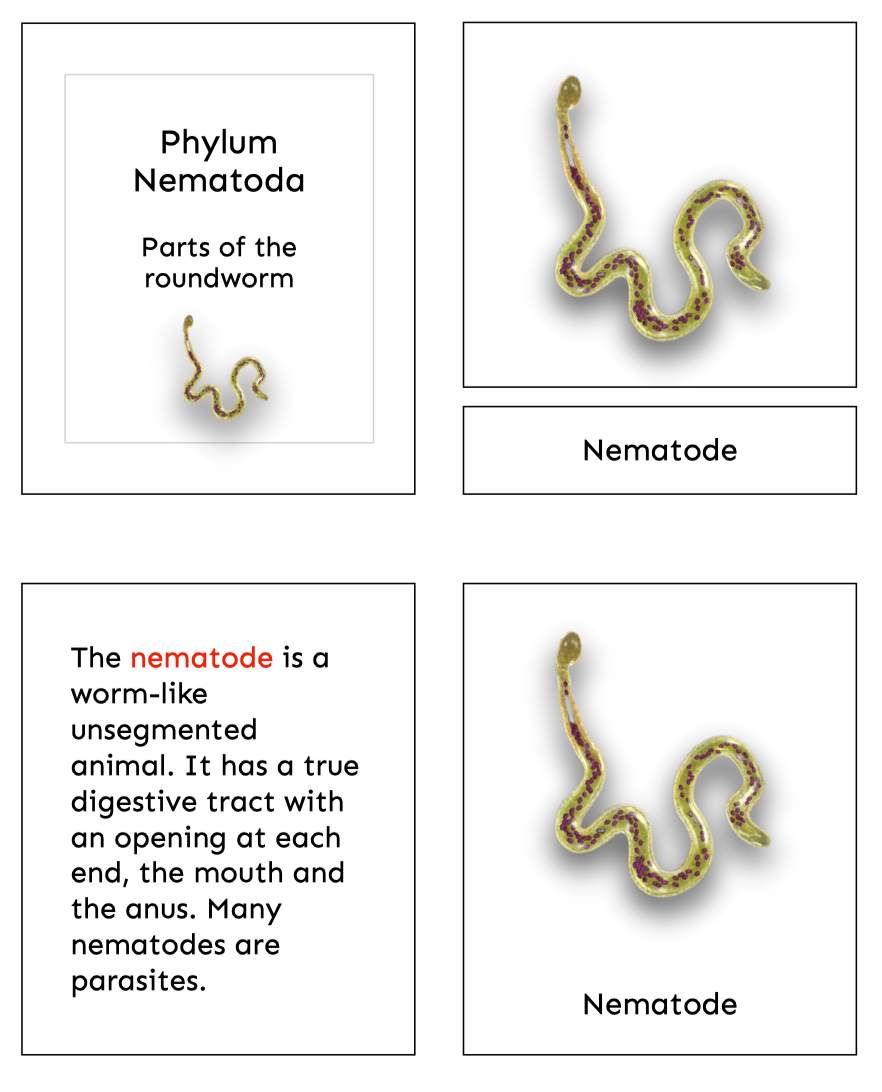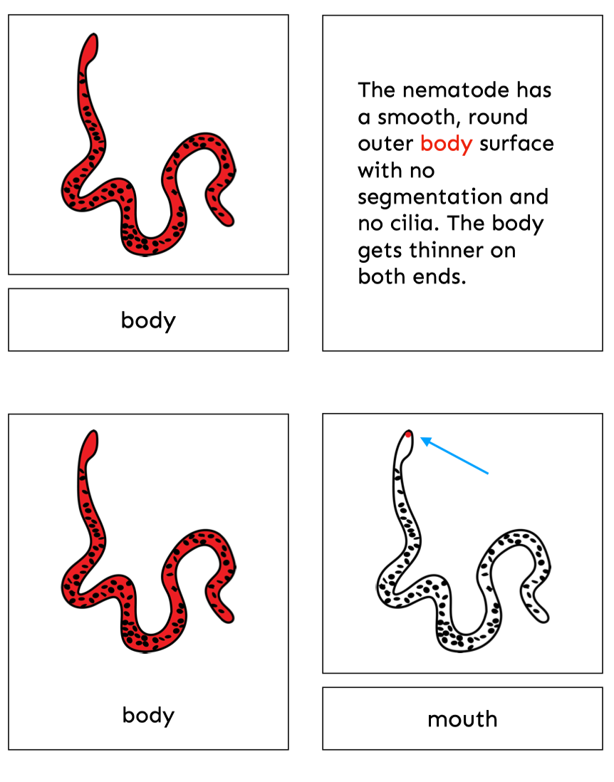 These printable Montessori nomenclature cards introduce children to the parts of the roundworm through a real photograph cover card and detailed scientific illustrations, paired with child-friendly descriptions.