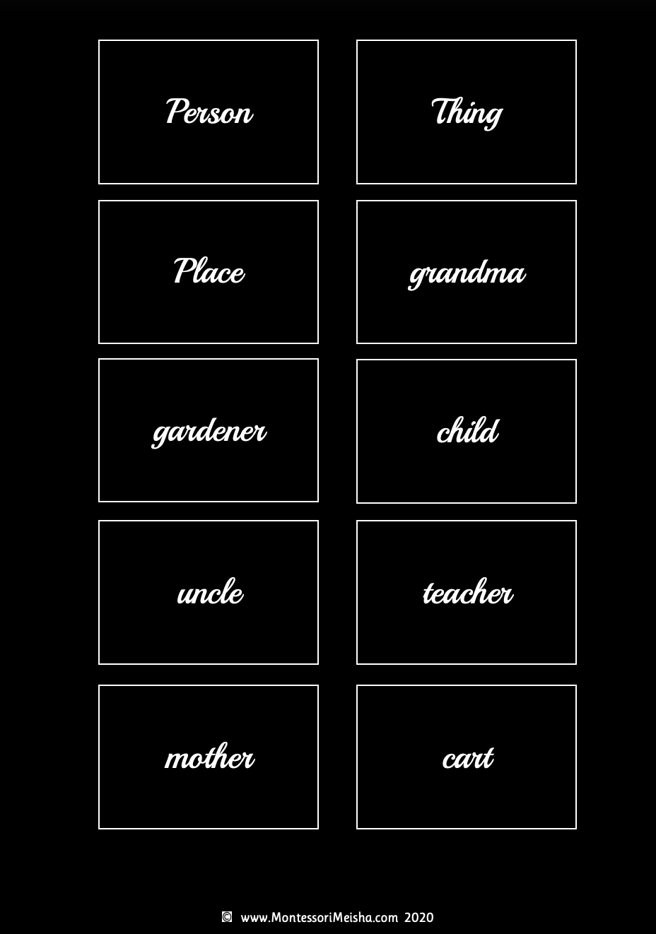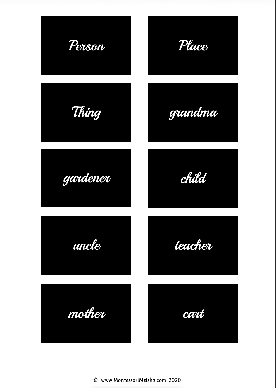 montessori grammar box — person, place and thing nouns (cursive)Person, Place and Thing Nouns (Cursive)