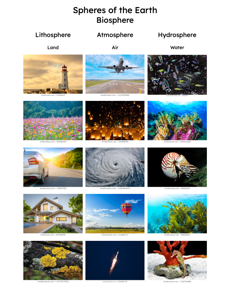 - 3 category label cards: Atmosphere, Lithosphere, Hydrosphere (Air, Land, Water)