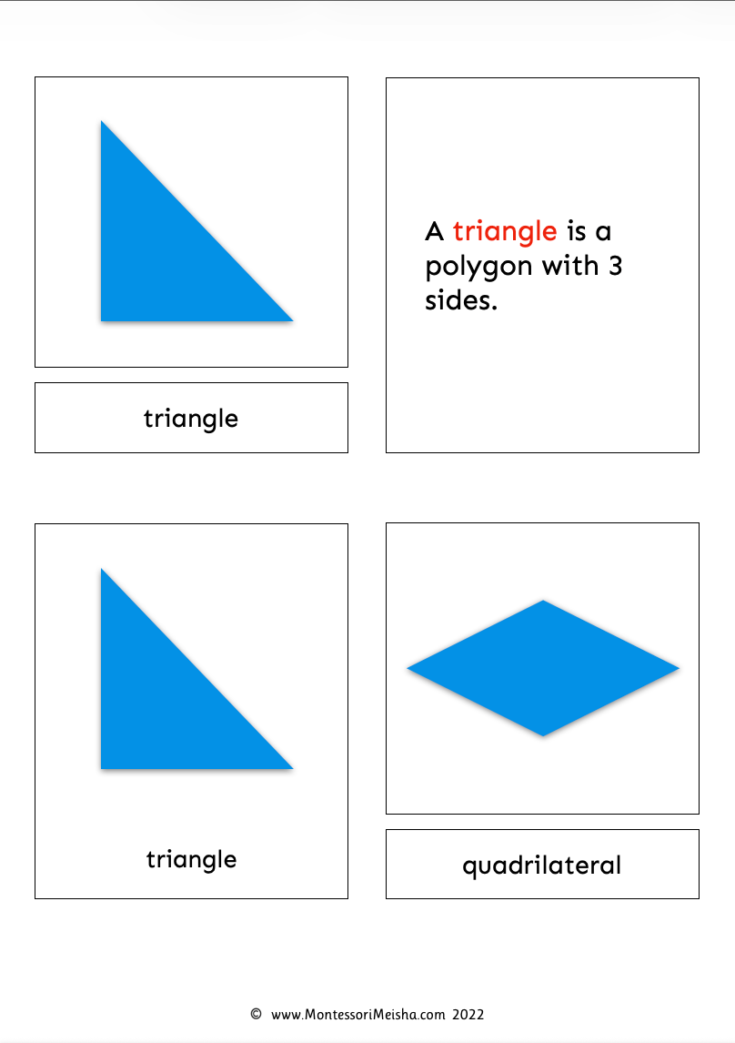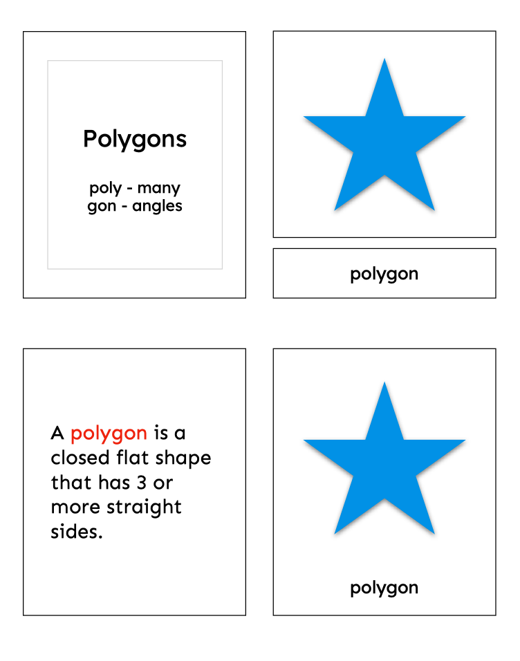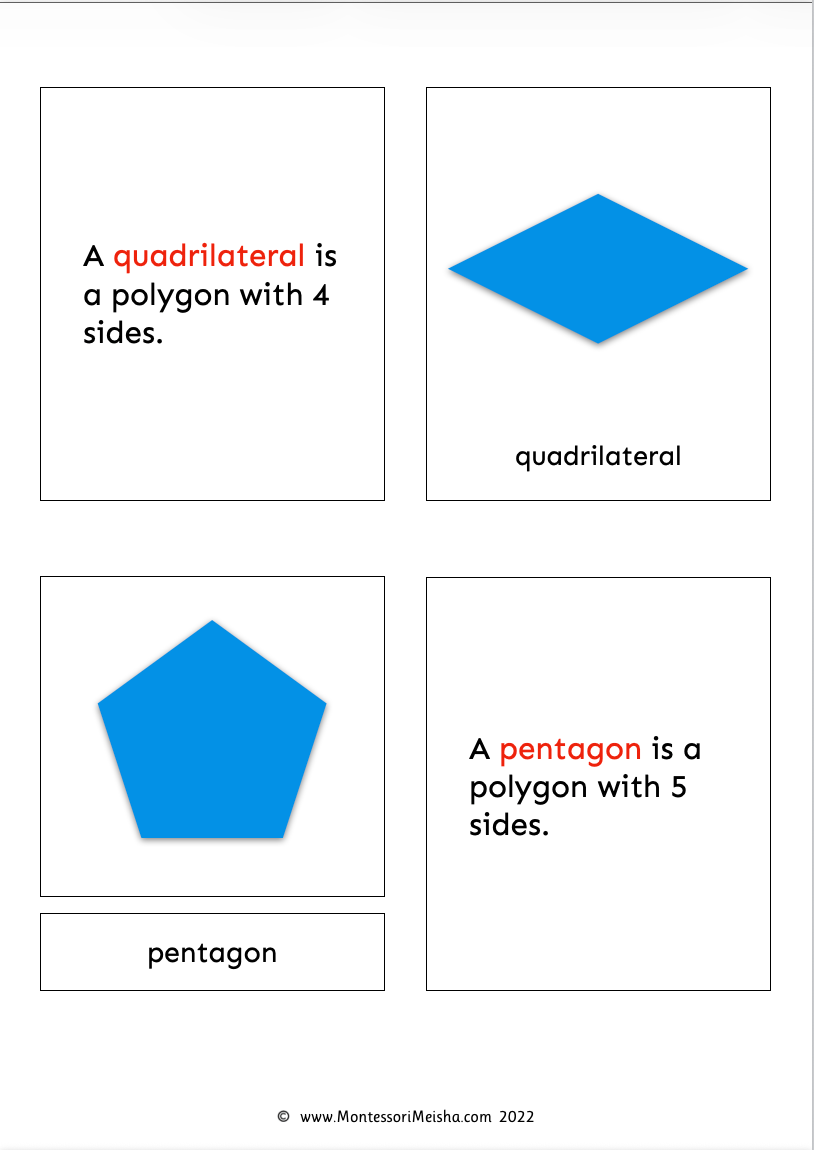 These printable Montessori four-part nomenclature cards introduce children to eight polygons from the humble triangle all the way to the decagon, through detailed illustration cards paired with child-friendly descriptions.